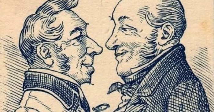 Na první pohled se obrázek jeví jako zcela jasný: dva dobře oblečení pánové z 19. století, kteří stojí proti sobě a zdvořile konverzují. Jejich detailní rysy – ostré nosy, upravené kabáty a staromódní kotlety – působí jako klasická skica té doby. Ale když se podíváte blíže, uvědomíte si, že se v ní skrývá mnohem více.