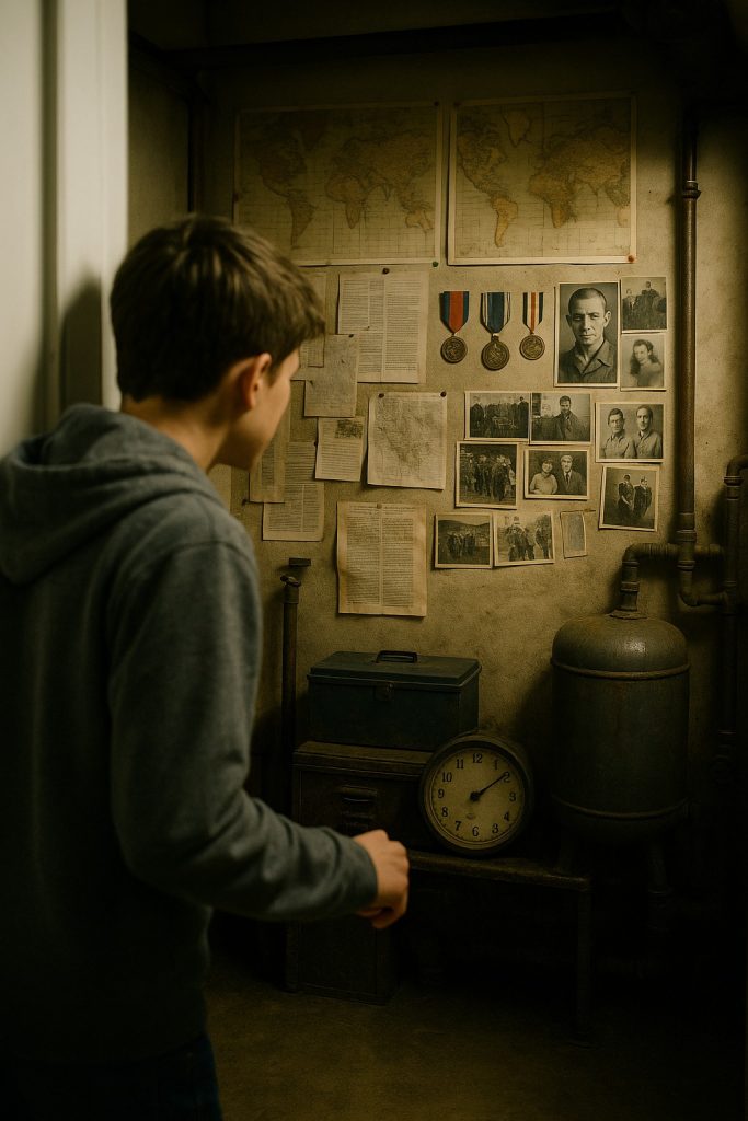 Kotelna nebyla jen trubky a ventily. Stěny byly pokryty mapami, výstřižky z novin a černobílými fotografiemi. Vybledlé medaile visely v úhledných řadách. Ležel tam velký otevřený kufr, nacpaný spisy a složkami.