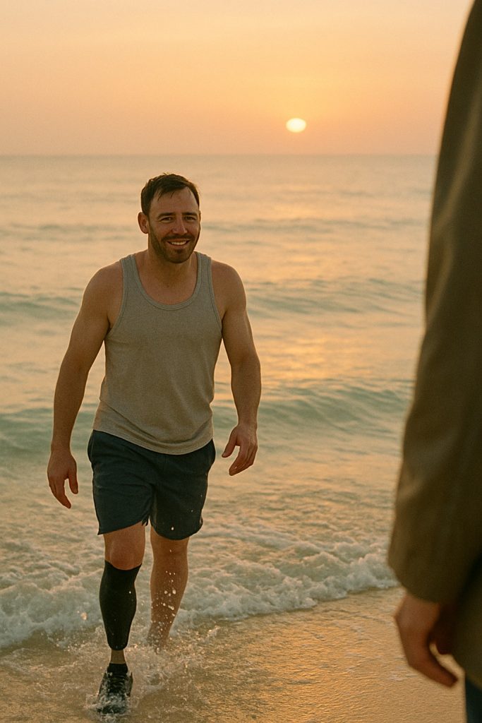 Později, když seděl na břehu, sundal protézu a položil ji vedle sebe. Slunce už zapadalo a moře šumělo klidně.