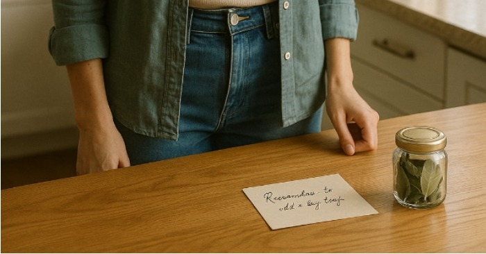 Na kuchyňském stole stála malá sklenice s bobkovými listy a lístek: