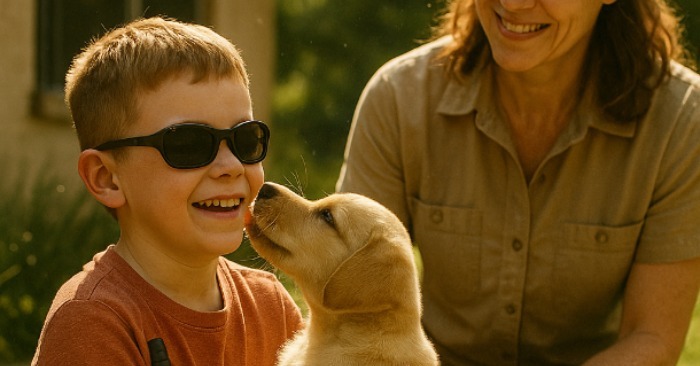 Každé ráno chodili stejnou trasou: dům, park, lavička u fontány, a zpátky. Lidé si na ně zvykli — na chlapce s holí a zlatého psa, který chápal všechno beze slov.