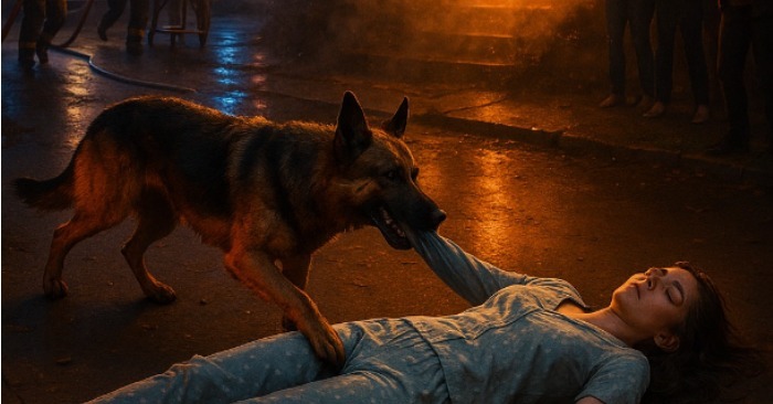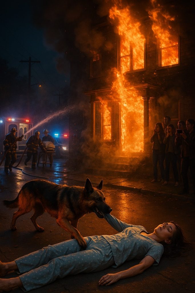 Anna, oslabená kouřem, sotva stála na nohou, ale Luna ji nepouštěla. V každé chvíli, kdy se zdálo, že je oheň pohltí, Luna našla cestu. Uši měla přitisknuté, ocas stažený, ale v očích jí planulo odhodlání — věděla přesně, kam vést.