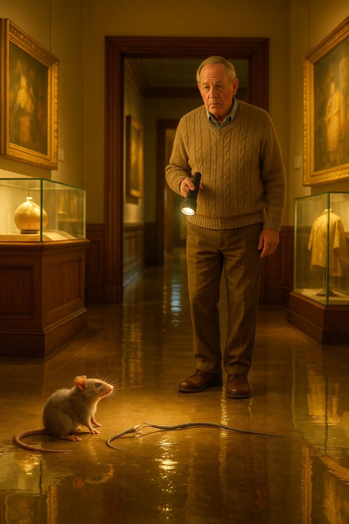 Ráno obcházel sály. Ve vzduchu byl cítit kouř a vlhko, slunce se prodíralo přes matná okna. Pod schody zahlédl pohyb. Tam, ve stínu, seděla ona — malá šedá myš, mokrá, třesoucí se, a vedle ní kus překousaného drátu.