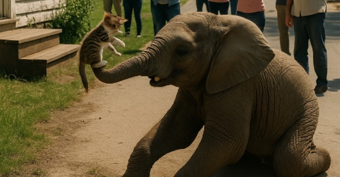 Obr poklekl, natáhl chobot — a kotě, jako by to čekalo, skočilo přímo na něj. Diváci zalapali po dechu. Ale strach rychle vystřídal úžas: slon začal kotě jemně houpat, jako na houpačce. To se drželo tlapkami a hlasitě přadlo. Za chvíli ho slon zlehka vyhodil do vzduchu a zase chytil. Vypadalo to, jako by tenhle kousek trénovali roky.