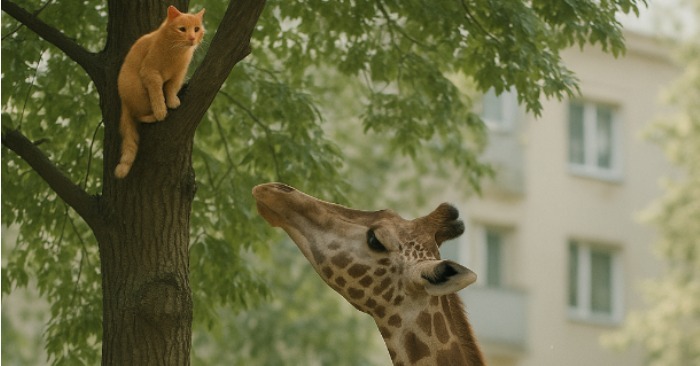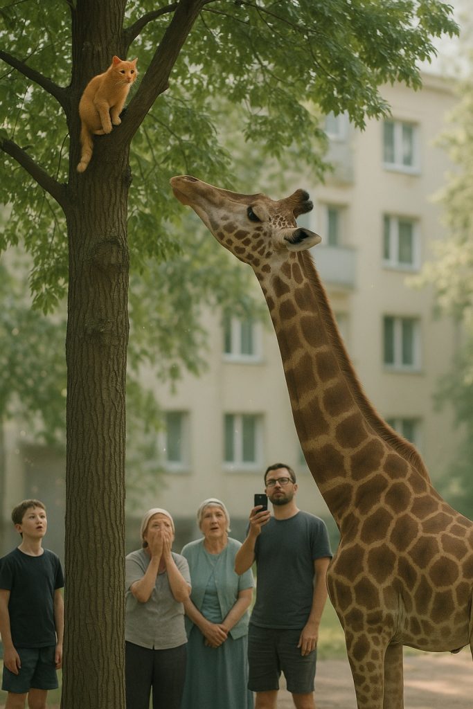 Kročil opatrně po asfaltu, jako by se bál narušit klid dvora. Lidé ztuhli. Někdo se rozesmál z rozpaků, někdo si zakryl ústa dlaní. Žirafa se zastavila u topolu, zvedla hlavu a podívala se přímo na kočku.