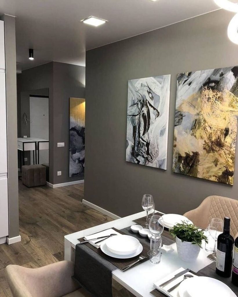 Rozhodli jsme se vylepšit atmosféru velkými abstraktními obrazy – černé tahy štětcem se zlatými akcenty vypadají neuvěřitelně výrazně. Podlaha je pokryta chladně šedým laminátem, který dokonale doplňuje celkové barevné schéma. Dveře mezi místnostmi jsme ponechali klasicky bílé a v kuchyni jsme dveře odstranili, čímž jsme vytvořili volný průchod.