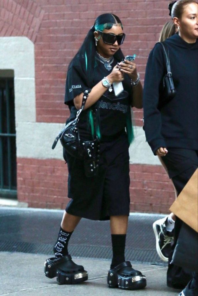 Jedenáctiletá North se objevila v obrovských dřevácích na platformě, nadměrně velkých brýlích „pro dospělé“ a s vlasy obarvenými jasněji než vzhled její matky z jejích skandálních výjezdů. Lidé na ulici se otáčeli – někteří se usmívali, jiní se ptali: „Co se děje?“