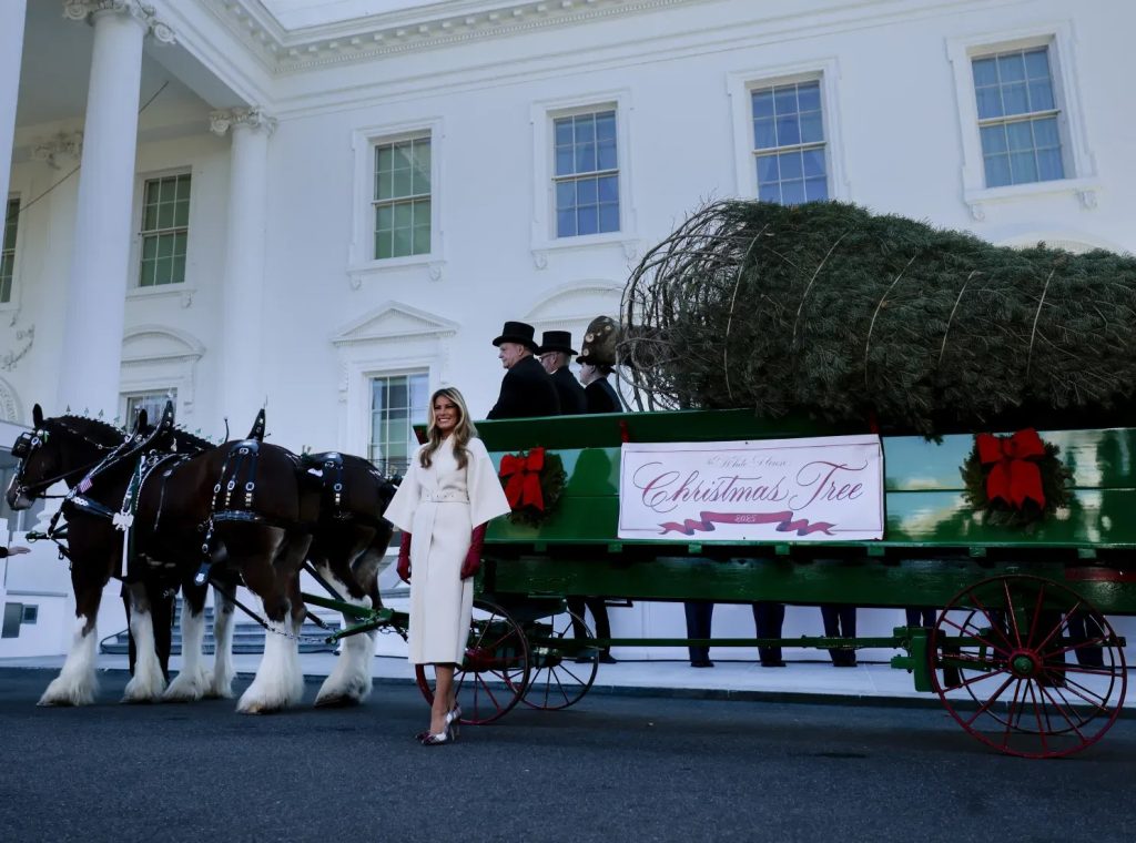 První byla tradiční vánoční recepce u stromečku, která každoročně zahajuje zimní sváteční období. Melania vystoupila v elegantním bílém obleku od Diora, doplněném vínovými koženými rukavicemi.