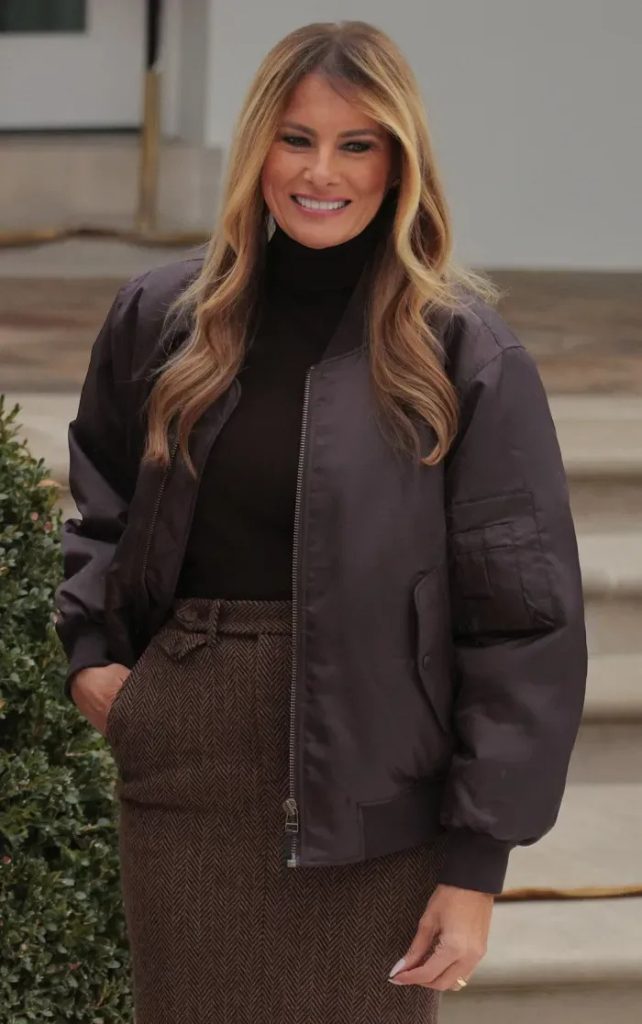 Pro tento výstup Melania zvolila teplý, hnědý celkový vzhled: rolák, pouzdrovou sukni, bomber bundu a odpovídající boty. Vzhled byl decentní, ale harmonický.