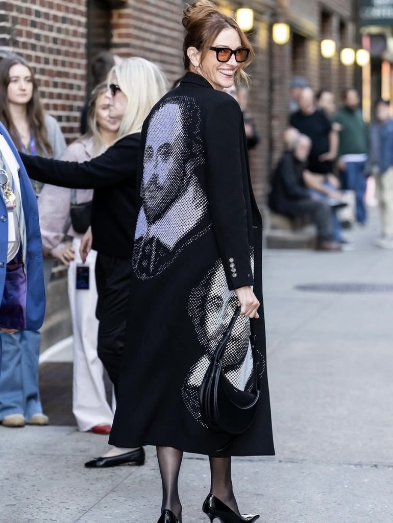 Hvězda měla na sobě kabát Libertine ozdobený velkým portrétem Williama Shakespeara, který zabíral přední i zadní část oděvu. Tato volba dodala vzhledu teatrální a odvážný nádech – právě tu kombinaci Robertsová umí s obzvláštní sebedůvěrou zvládnout.