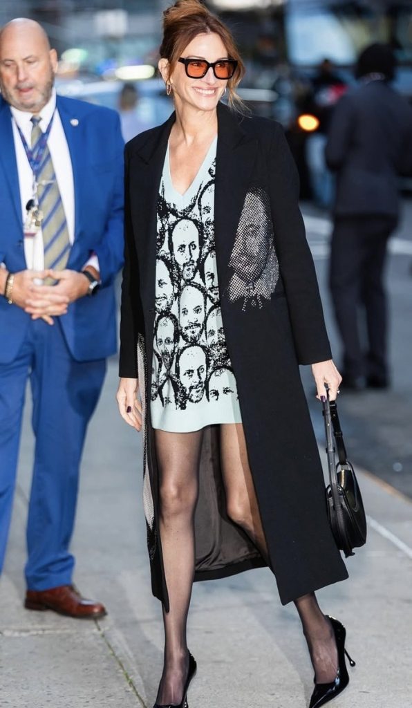 Začátkem října byla herečka spatřena v New Yorku, jak míří na natáčení filmu The Late Show se Stephenem Colbertem. Julia sebevědomě kráčela směrem ke studiu a přitahovala pozornost všech nejen svým úsměvem, ale i neuvěřitelně stylovým vzhledem. Tentokrát zvolila outfit, který doslova prolíná módu a umění – a dělá to tak plynule, jako by to tak mělo být.