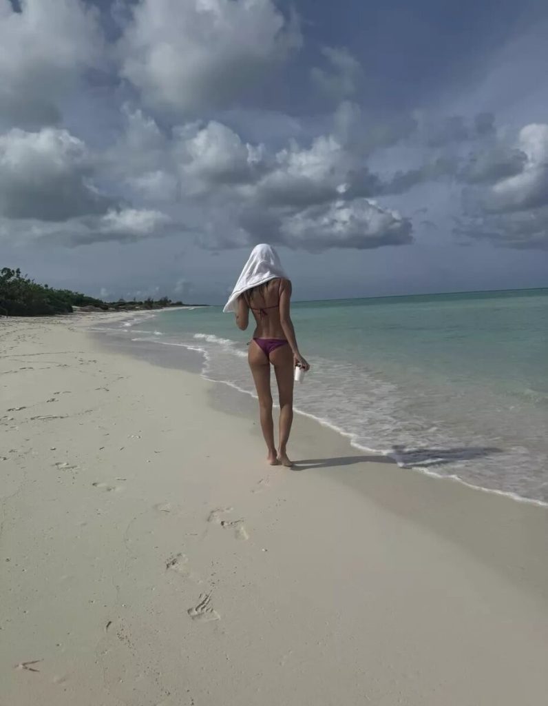 Focení později pokračovalo na odlehlé pláži. Irina se v záběru objevila s bílým ručníkem na hlavě – jednoduchý detail, který krásně kontrastoval s jejím zlatavým opálením. V kombinaci s oceánem a opuštěným pobřežím fotografie získaly téměř filmovou kvalitu.