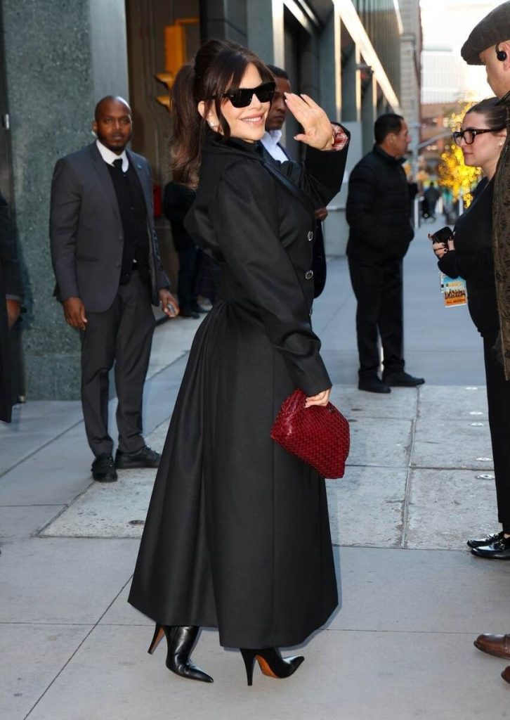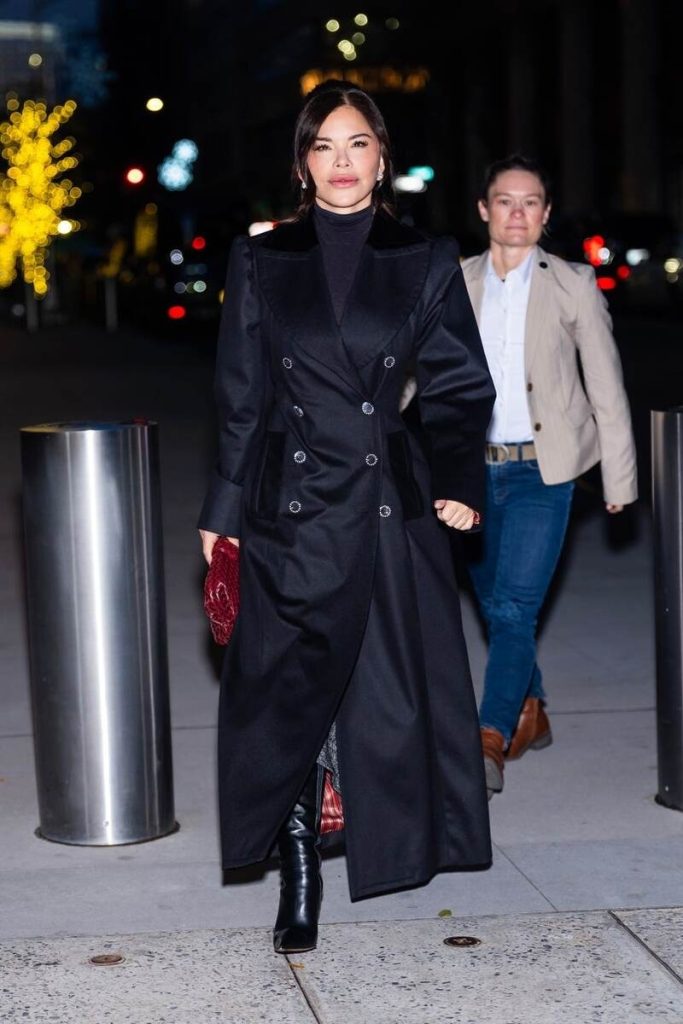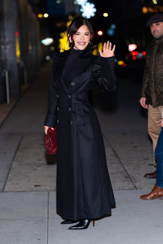 Vrcholem jejího vzhledu byl dlouhý černý kabát s dvouřadým zapínáním, strukturovanými rameny a kontrastními knoflíky s bílými akcenty. Jemný lesk látky dodal vzhledu elegantní nádech. Pod kabátem měla Lauren na sobě průsvitný rolák a měkkou pletenou sukni – kombinace, která spojuje modernitu s klasickým stylem.
