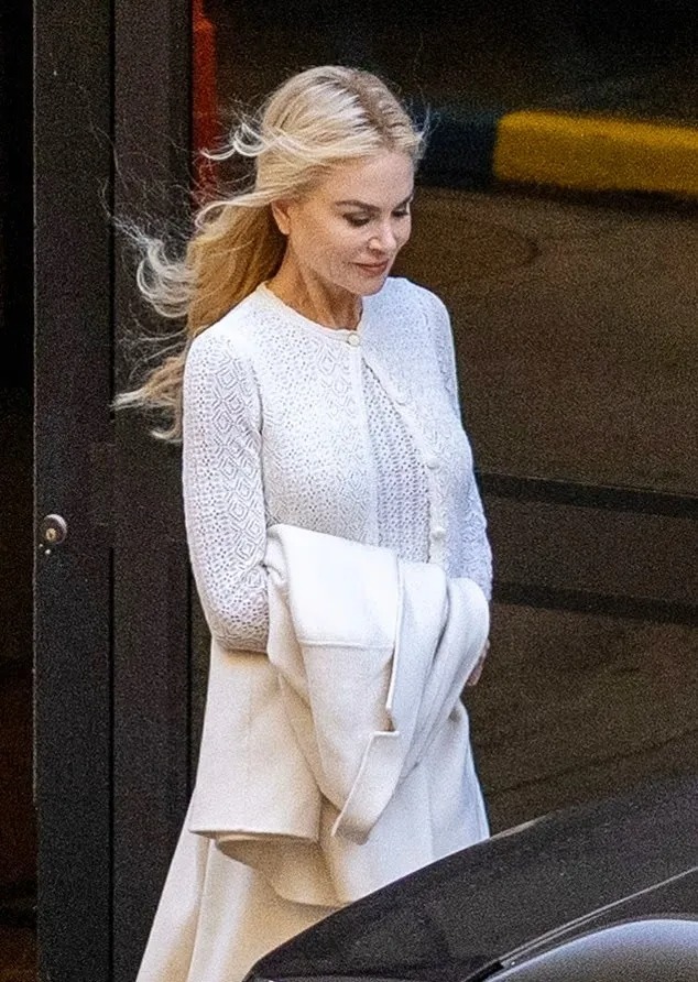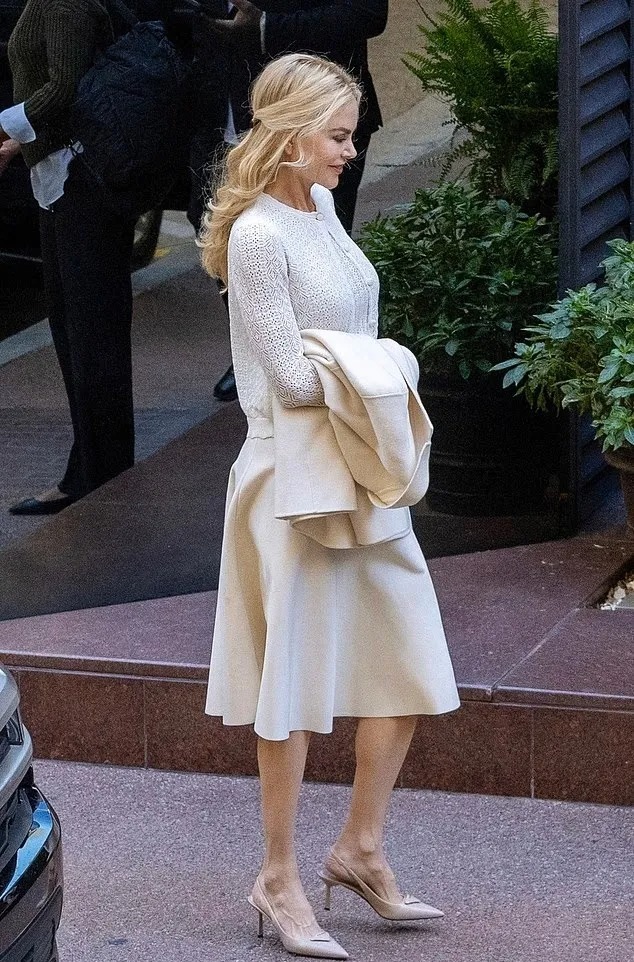 Pro svůj vzhled si Nicole zvolila elegantní, téměř symbolický vzhled. Měla na sobě svěží bílý kardigan přehozený přes pletený top a splývavou midi sukni áčkového střihu. Přes paži měla ležérně přehozený krémový trenčkot, který celku dodal jemnost a zdrženlivost.