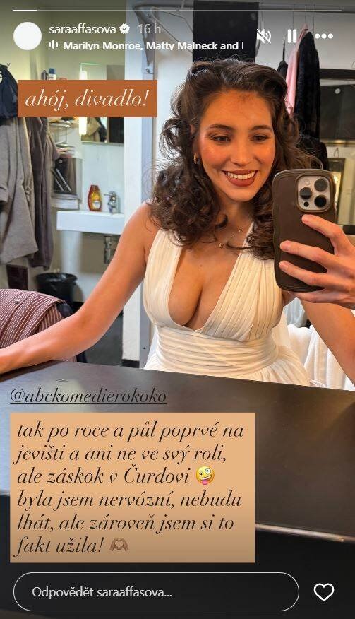 Sára Donutilová, herečka a manželka herce Martina Donutila, se po roční pauze vrátila na divadelní prkna s velkým stylem. Po narození svého syna Eliáše (1,5) to pro ni byla výzva, ale zároveň i splnění velkého snu – opět se postavit před diváky. V pondělí večer se objevila na jevišti divadla ABC, kde hrála v odvážném kostýmu, který rozhodně nezůstal bez povšimnutí. Její bílé šaty s hlubokým výstřihem a perfektně upravené kudrlinky ve vlasech byly v kontrastu s její nervozitou, kterou přiznala.
