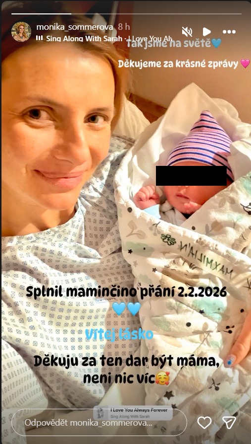 Sommerová se o radostnou zprávu podělila prostřednictvím fotografie, ke které připojila krátký, ale silný vzkaz. Naznačila, že narození syna bylo splněním jejího přání a že mateřství vnímá jako jeden z největších darů v životě. Emoce z jejích slov byly znát na první pohled.
