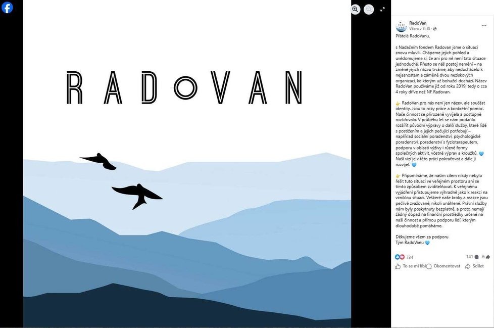 Do celé situace se vyjádřil i samotný spolek RadoVan. Uvedl, že s nadačním fondem komunikuje a chápe jeho pozici, zároveň ale připomněl, že název používá už od roku 2019. Podle jeho zástupců je RadoVan součástí identity organizace, která se dlouhodobě věnuje pomoci lidem s handicapem, a právě proto na změně názvu trvá.