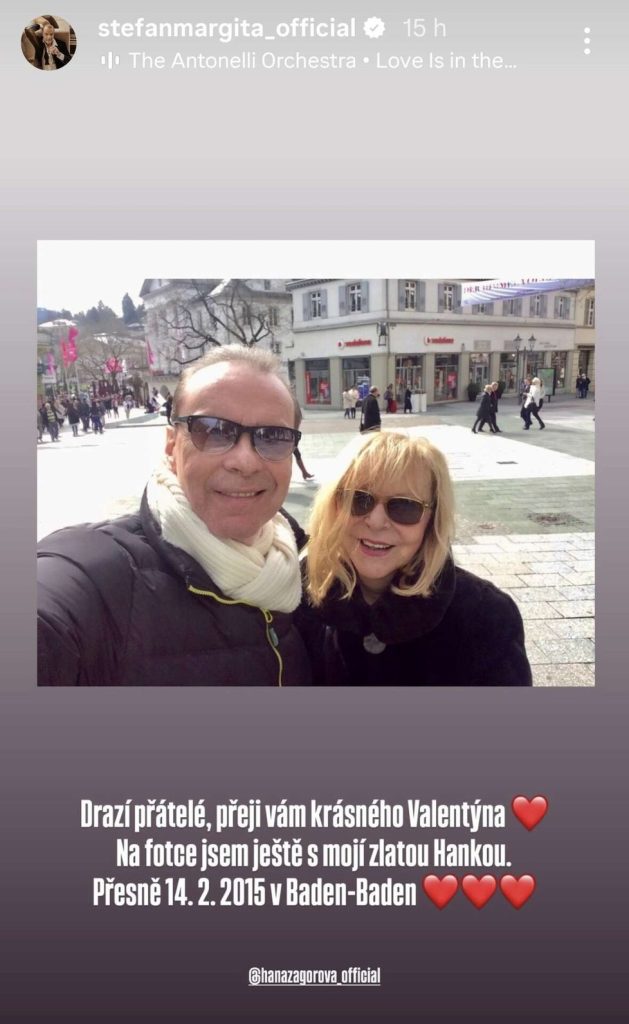 Operní pěvec se na sociálních sítích vrátil do roku 2015. V instastories zveřejnil společný snímek s Hanou Zagorovou, pořízený 14. února v německém Baden-Badenu. Na fotografii jsou oba v objetí, usměvaví a zjevně šťastní. K momentce připojil jednoduchý, ale silný vzkaz: „Drazí přátelé, přeji vám krásného Valentýna. Na fotce jsem ještě s mojí zlatou Hankou… přesně 14. 2. 2015 v Baden-Baden.“