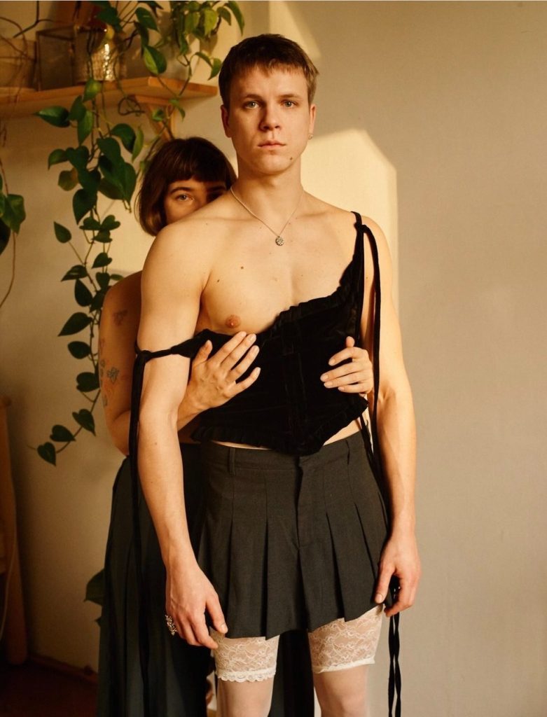 Dvojice si totiž vyměnila šatník. Katarzie, vlastním jménem Katarína Kubošiová, oblékla pánský oblek a působila sebejistě, téměř přísně. Piškula naopak před objektivem fotografky Hany Knížové zapózoval v topu, minisukni a bílých punčochách s krajkovým lemem. Výsledek? Odvážný, hravý a rozhodně nepřehlédnutelný.