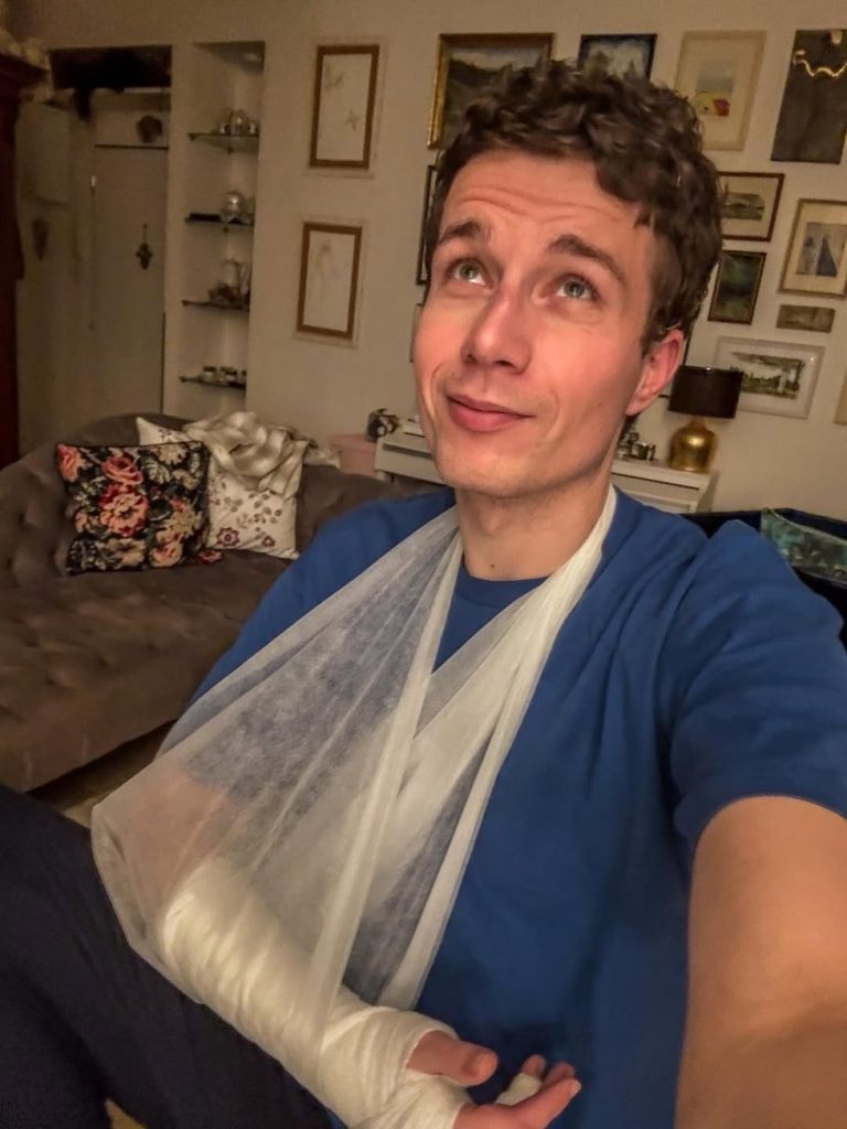 Nakonec zasáhl partner, který ho přiměl, aby si ruku nechal vyšetřit. Výsledek? Sádra až po loket. „Jukli se na to a mám ruku v sádře. Po loket,“ uvedl herec, kterému teď levá ruka zůstane zafixovaná zhruba měsíc.