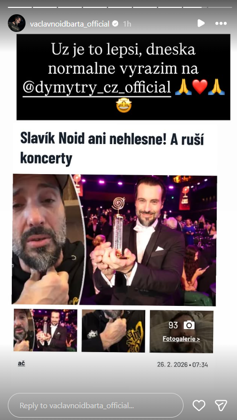 Pro zpěváka je hlas vším. A právě o ten teď Václav Noid Bárta přišel. Loňský zlatý slavík čelí náhlým zdravotním komplikacím, které mu znemožnily vystoupit před vyprodaným sálem. Fanoušci místo koncertu dostali omluvu a nový termín.