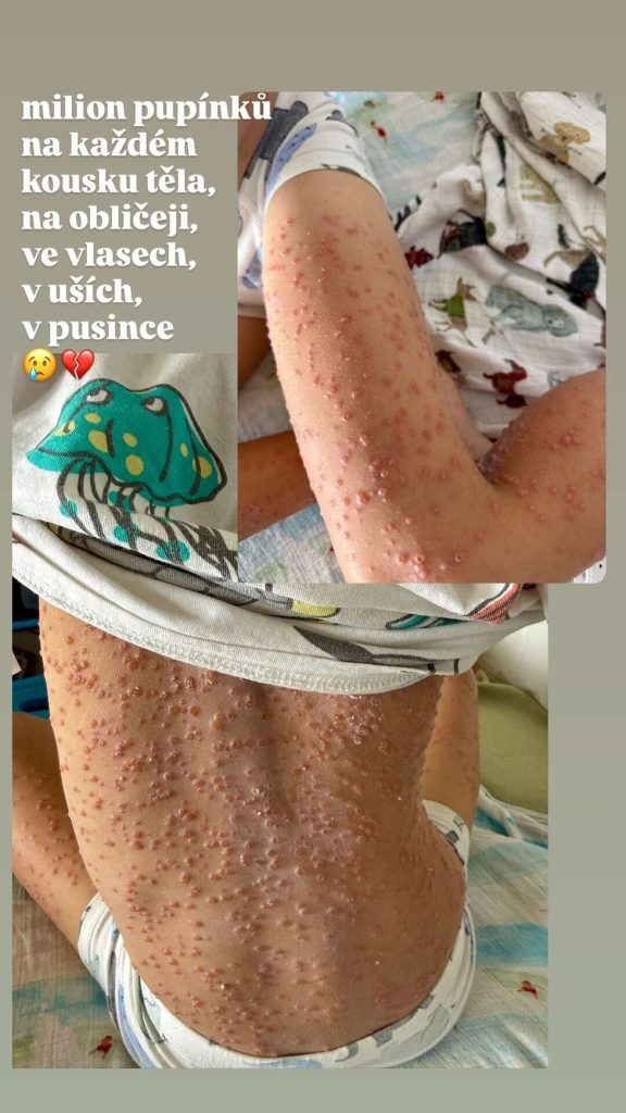 Svědivé puchýřky se nevyhnuly ani citlivým místům. Objevily se na obličeji, ve vlasech, v uších i v ústech. Právě postižení sliznic je u malých dětí obzvlášť náročné, protože může ztížit příjem tekutin a vést k dehydrataci. Nikola popisuje dny plné bezmoci, kdy sleduje utrpení vlastního dítěte a snaží se mu ulevit, jak jen to jde.