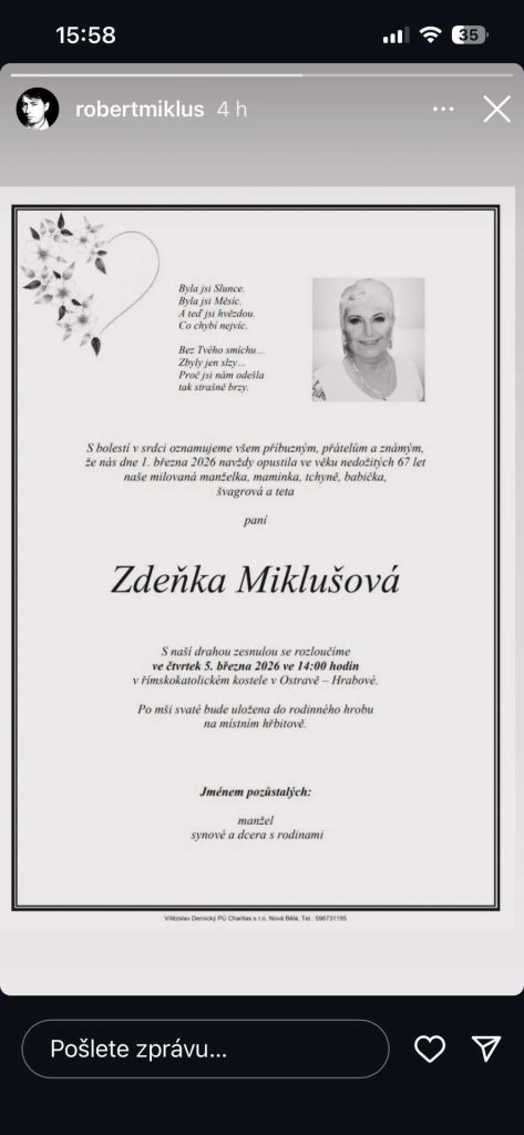 „S bolestí v srdci oznamujeme všem příbuzným, přátelům a známým, že nás dne 1. března 2026 navždy opustila ve věku nedožitých 67 let naše milovaná manželka, maminka, tchyně, babička, švagrová a teta, paní Zdeňka Miklušová,“ stojí ve smutečním oznámení.