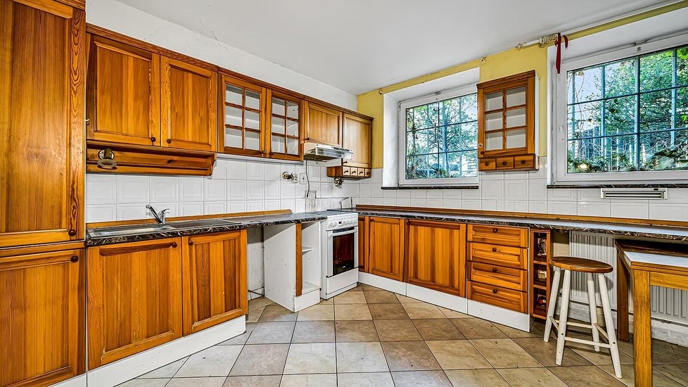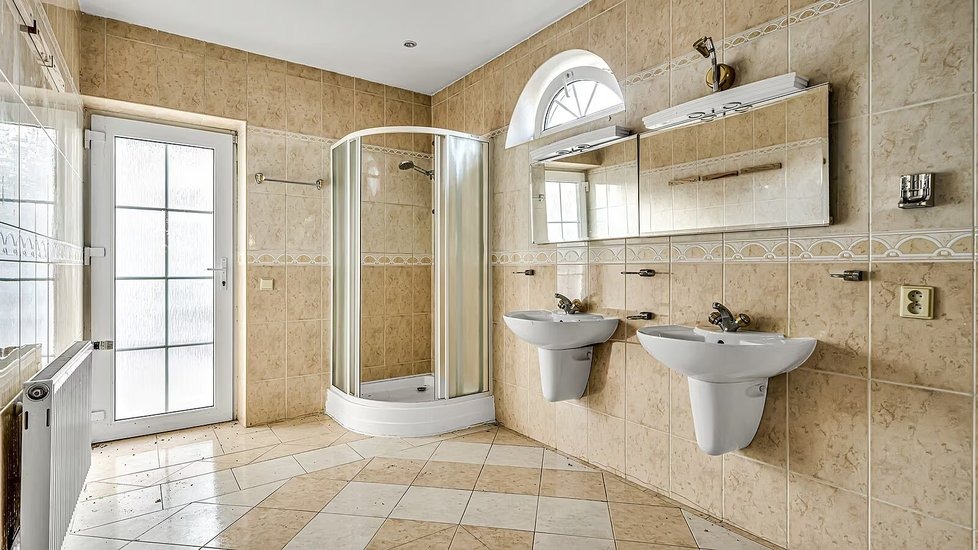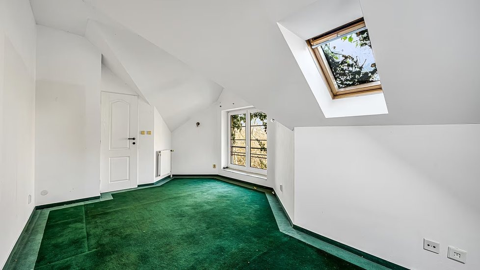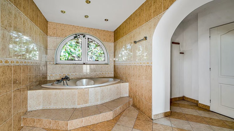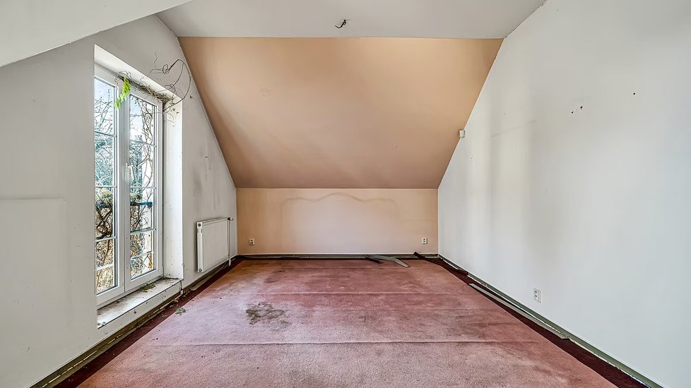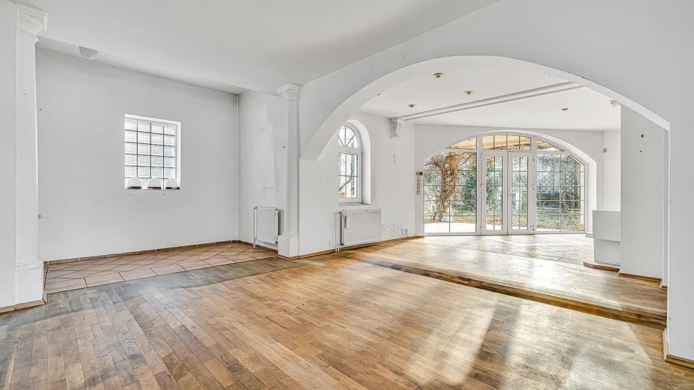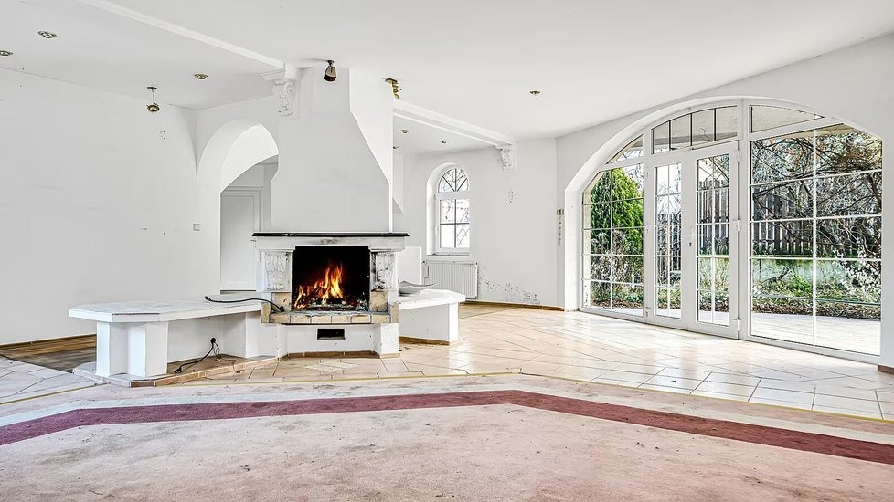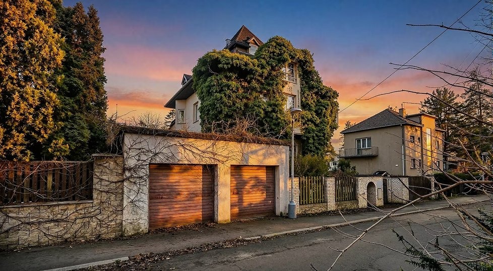 K domu náleží také zahrada, která je momentálně místy zarostlá, a zázemí doplňuje krytý bazén. Nový majitel bude mít k dispozici i dvě samostatné garáže. Celková obytná plocha přibližně 445 metrů čtverečních nabízí dostatek prostoru, takže vila může sloužit i jako vícegenerační bydlení.