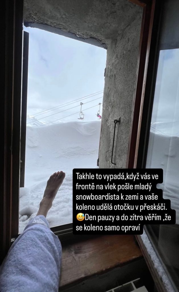 Mladý snowboardista do herečky narazil tak nešťastně, že skončila na zemi. Nebyl to jen lehký kontakt. Při pádu se jí koleno nepříjemně protočilo přímo v pevně utaženém přeskáči. V tu chvíli nebylo jasné, jak vážné to je. Bolest přišla okamžitě a s ní i obava, že si zbytek pobytu už neužije.
