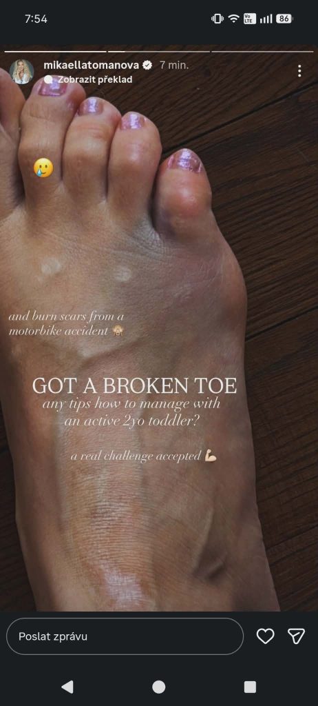 Za vším stála nepříjemná nehoda. Michaela si zlomila prst na noze a zranění bylo na první pohled nepřehlédnutelné. Fialové zbarvení a výrazná podlitina jasně ukazovaly, že bolest nebyla jen symbolická. Sama přiznala, že její noha si v poslední době prošla víc, než by si přála.