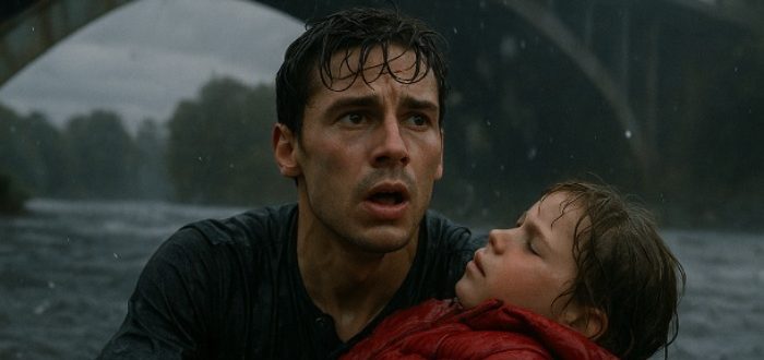 Řeka byla po silném dešti rozbouřená. Dav na mostě křičel, někteří volali záchranáře, jiní jen stáli a nevěděli, co dělat. Na hladině se mihla dětská bunda – červená,
